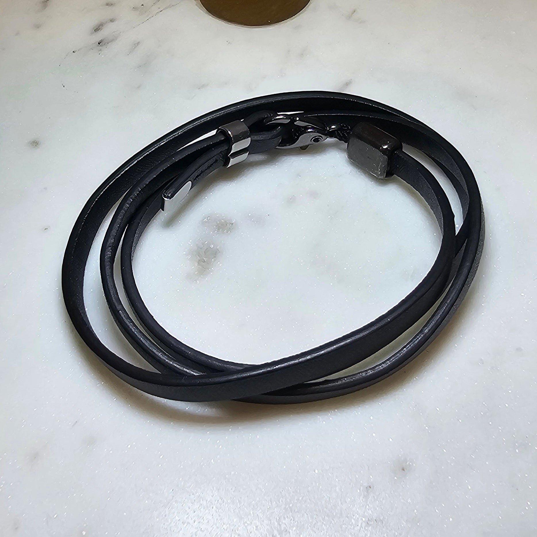 This classic and stylish men's bracelet features a triple black leather band with a sturdy stainless steel clasp. The combination of materials creates a durable and timeless piece that can be worn for any occasion. Expertly crafted and versatile, this bracelet is the perfect addition to any man's accessory collection.