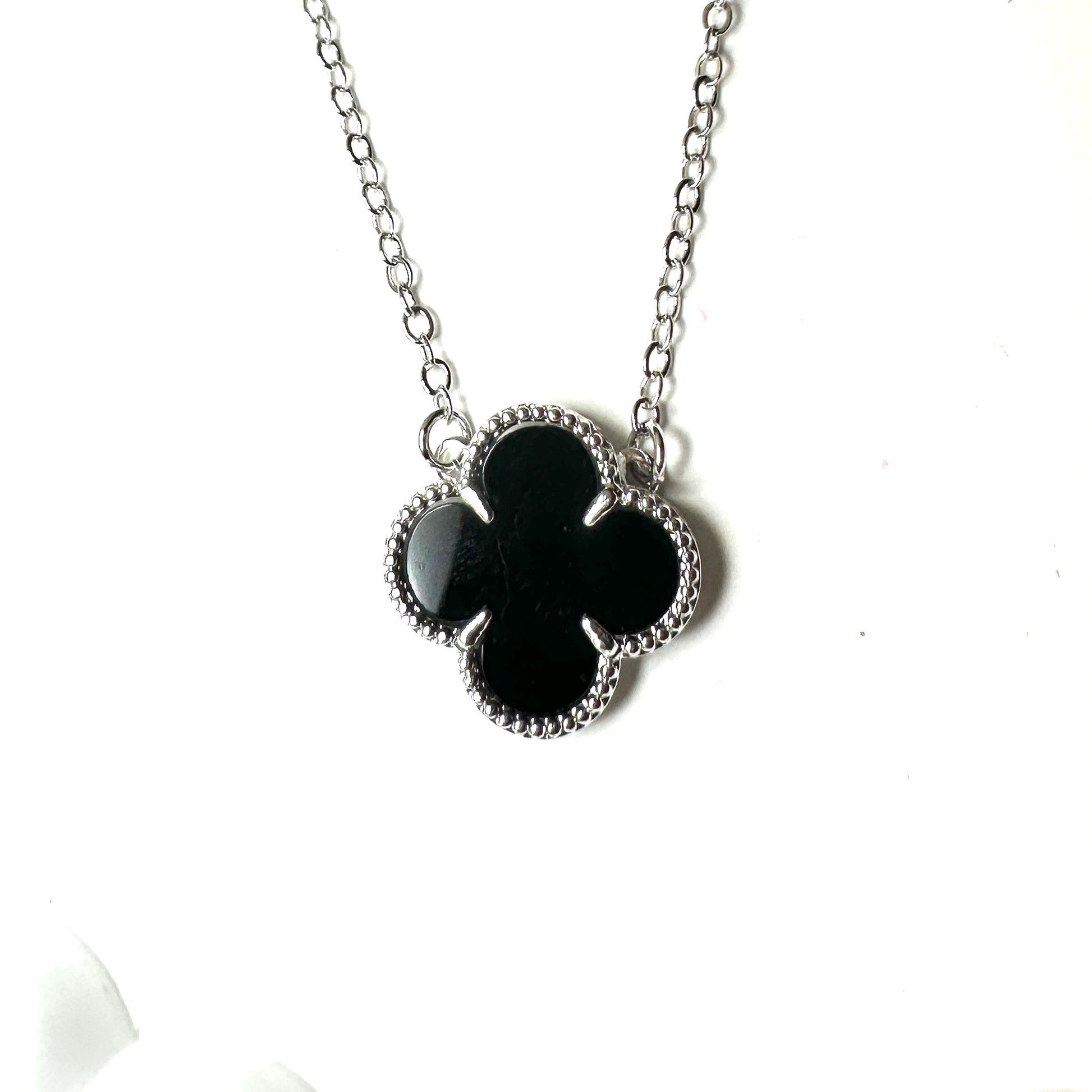 Black Lucky Clover - White Rhodium Plated Necklace - 47cm
